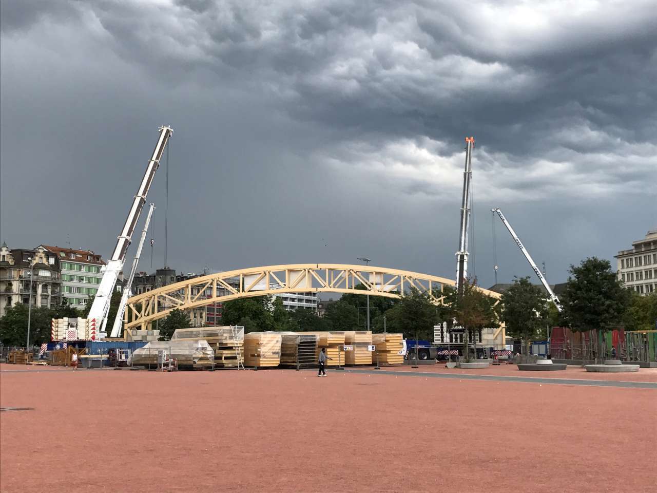 Un théâtre vertigineux de 700 places construit en bois suisse sort actuellement de terre, porté par une ferme (poutre) de 62 mètres de long.