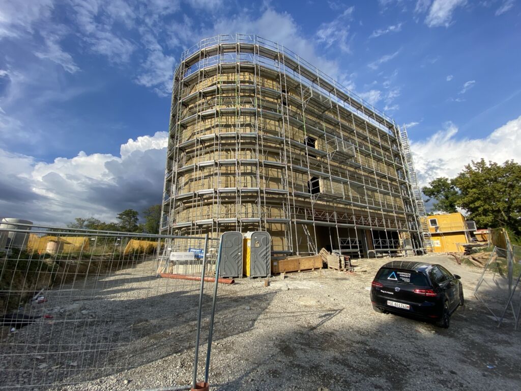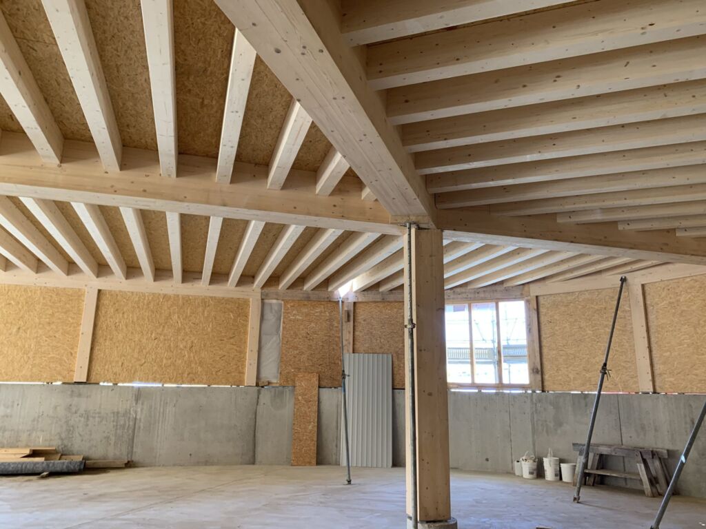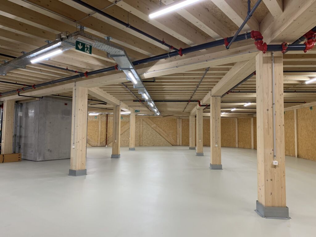 La halle de stockage de 4 niveaux comporte une structure porteuse en bois lamellé-collé à haute résistance ainsi qu’un système mixte bois/béton pour les dalles entre étages.