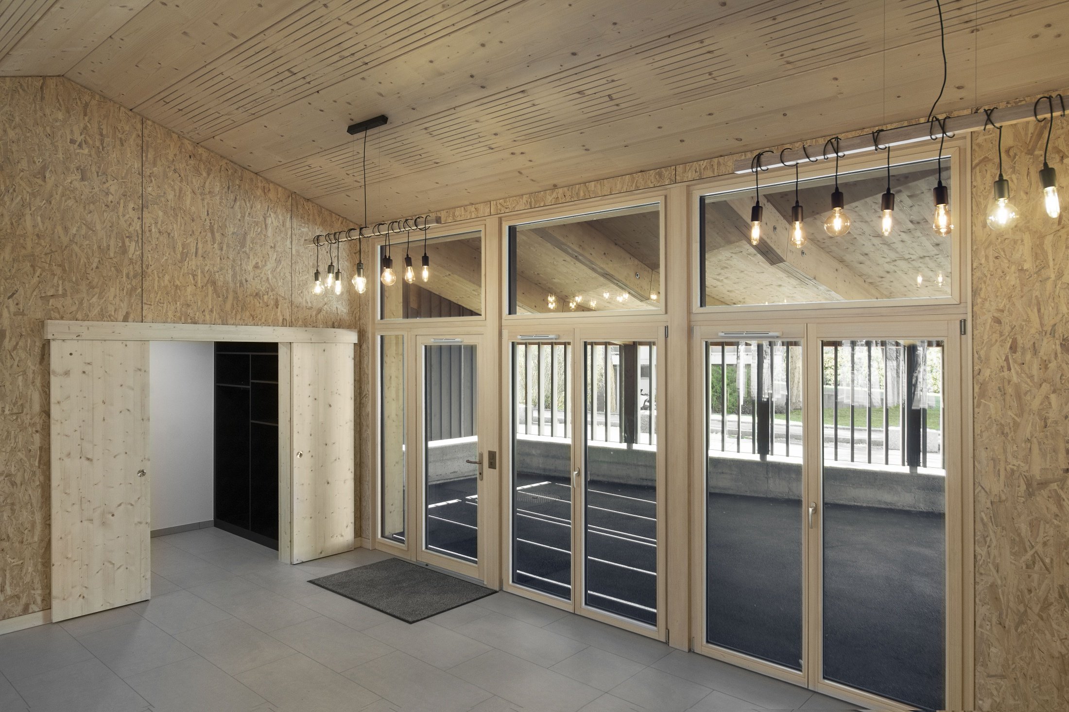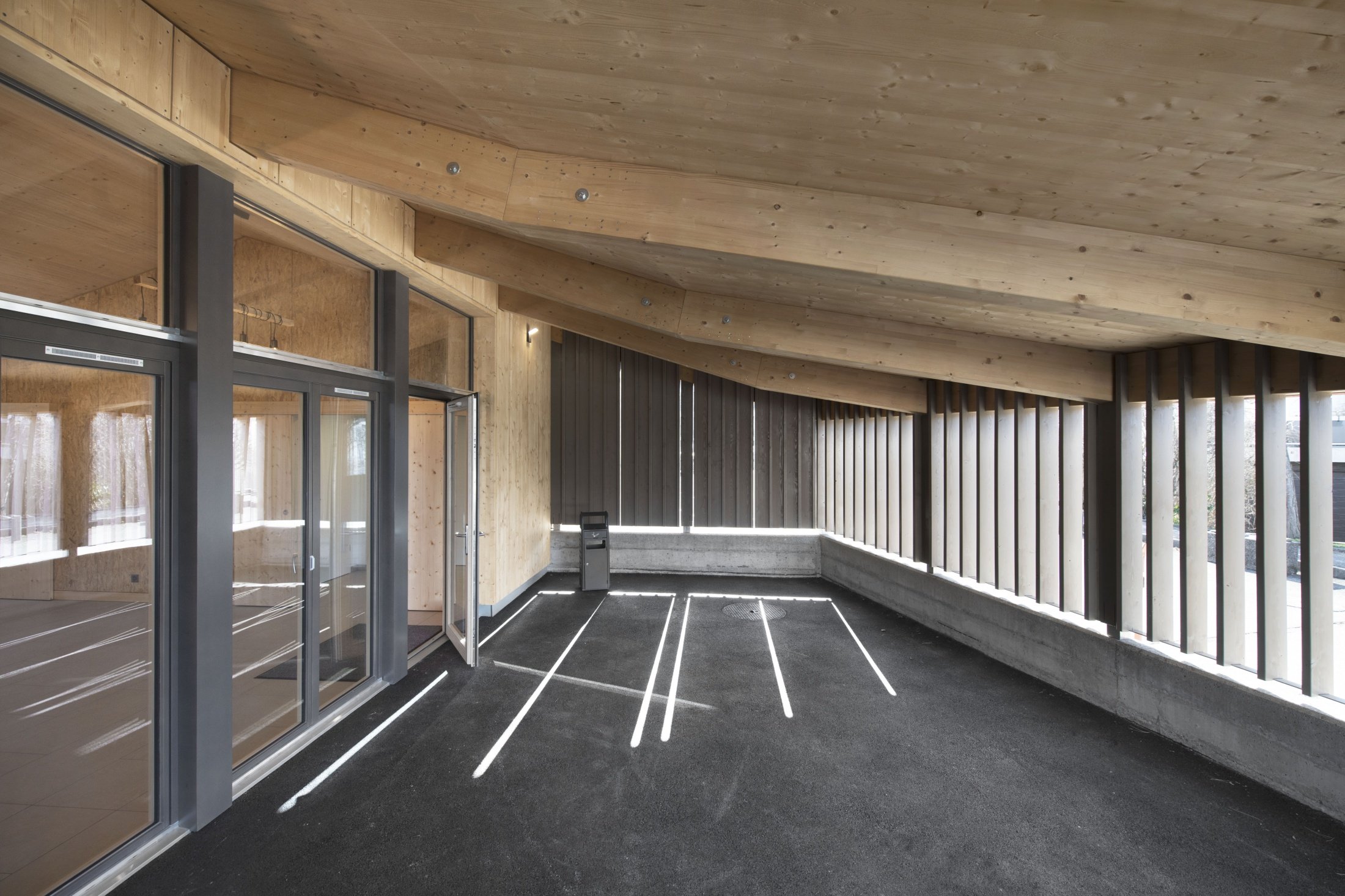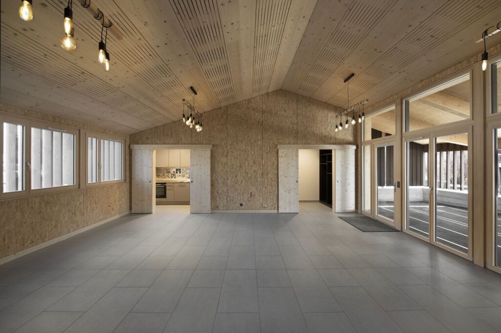 La salle polyvalente comporte un espace principal et un couvert extérieur de chacun 50 m2, ainsi qu’un vestiaire, des sanitaires, un local de rangement et une petite cuisine permettant une utilisation autonome de l’espace.